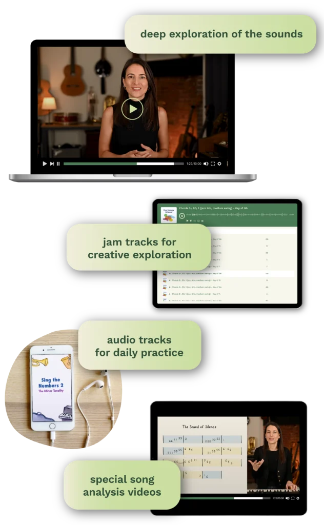 In each lesson you learn what to observe, and then I invite you to practice a series of activities that make the sounds truly yours: singing the sounds with the Sing the Numbers audio tracks, improvising and creating your own music over jam tracks, and finally listening to the sounds in real songs so you can start hearing them everywhere.